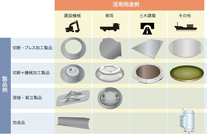 京葉ブランキング工業では、多種多様な加工ニーズにお応えする為に様々なサイズの鋼板を使用、 長年培った技術と豊富な設備を駆使してバラエティー豊かな製品群をお届けしています。 これらの製品は建設機械部材、自動車部材、橋梁や免震等の土木建築部材など多岐にわたる用途にご活用いただいています。